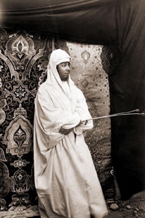 He continued to be fascinated by photography. The first group of pictures in the exhibition is a mixture of silver gelatin prints and stereoscopic glass plates (which need to be viewed through red and green spectacles, like Avatar or Toy Story 3). Many of the black-and-white prints are taken not by Veyre but by his pupil, Moulay Abdel Aziz, and they are a credit to master and student. We see portraits (of the Sultan, Veyre, Minister of War El Menheby, soldiers, ladies of the harem); scenes of wild horse and gun play at the fantasia; street scenes in Marrakech; and the Sultan riding out beneath his parasol of state. Most wonderful of all, perhaps, is the Sultan in jellaba on a bicycle, leading a group of European and Moorish courtiers across a ramp built over half-buried boats in the Cour des Amusements of the palace. Alongside these stills are projected scraps of moving picture from the same date, a cavalcade emerging from a gateway, a fantasia – perhaps the same one – tiny fragments of street scenery.