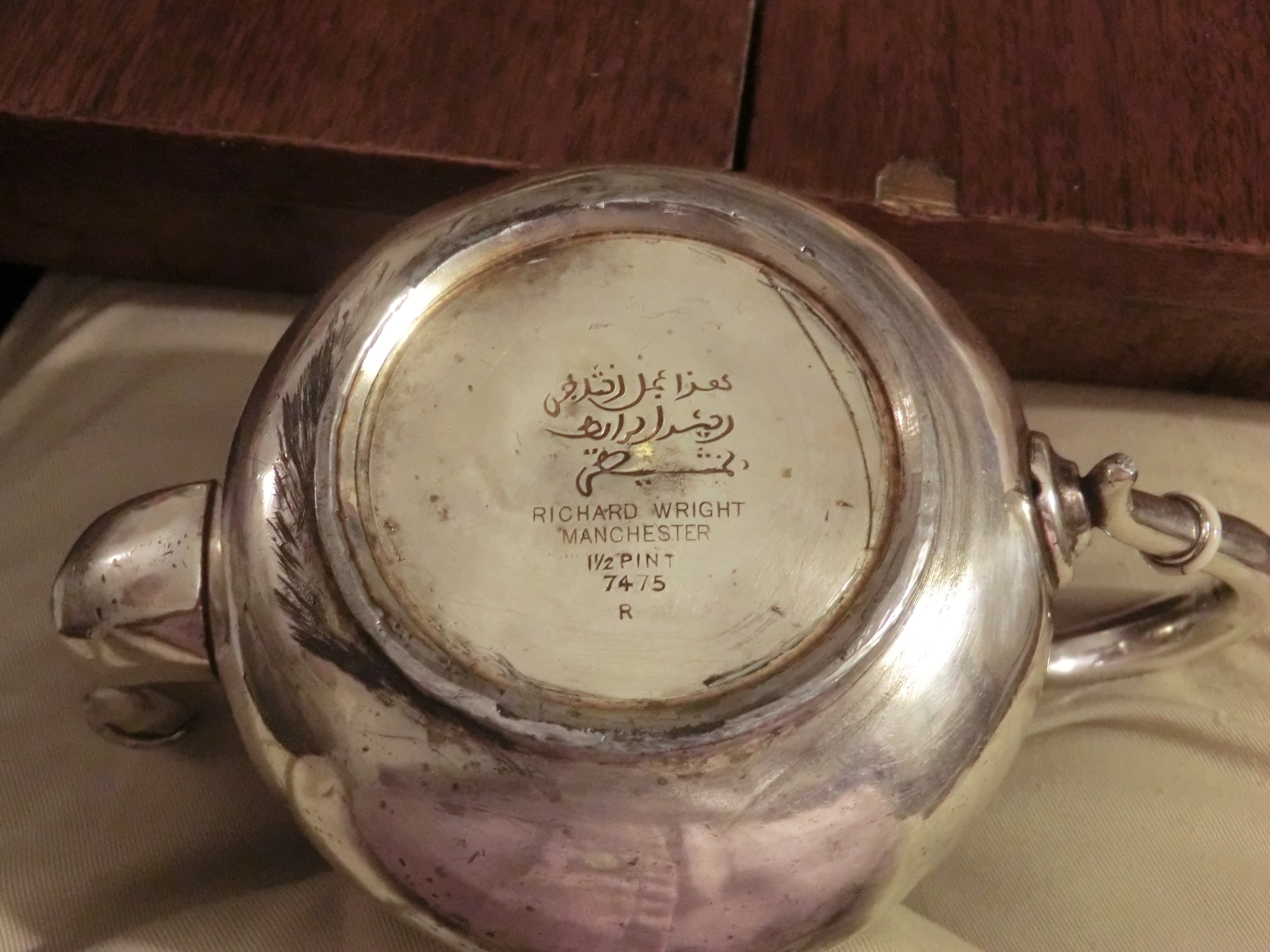 I’ve attached a few pictures. Do any of my readers have any idea about Richard Wright, or know anything about the silver-plate trade in Morocco? I’d be grateful for any references, anecdotes, photographs or other information. This is his mark, stamped on the base of his export items in English and Arabic: