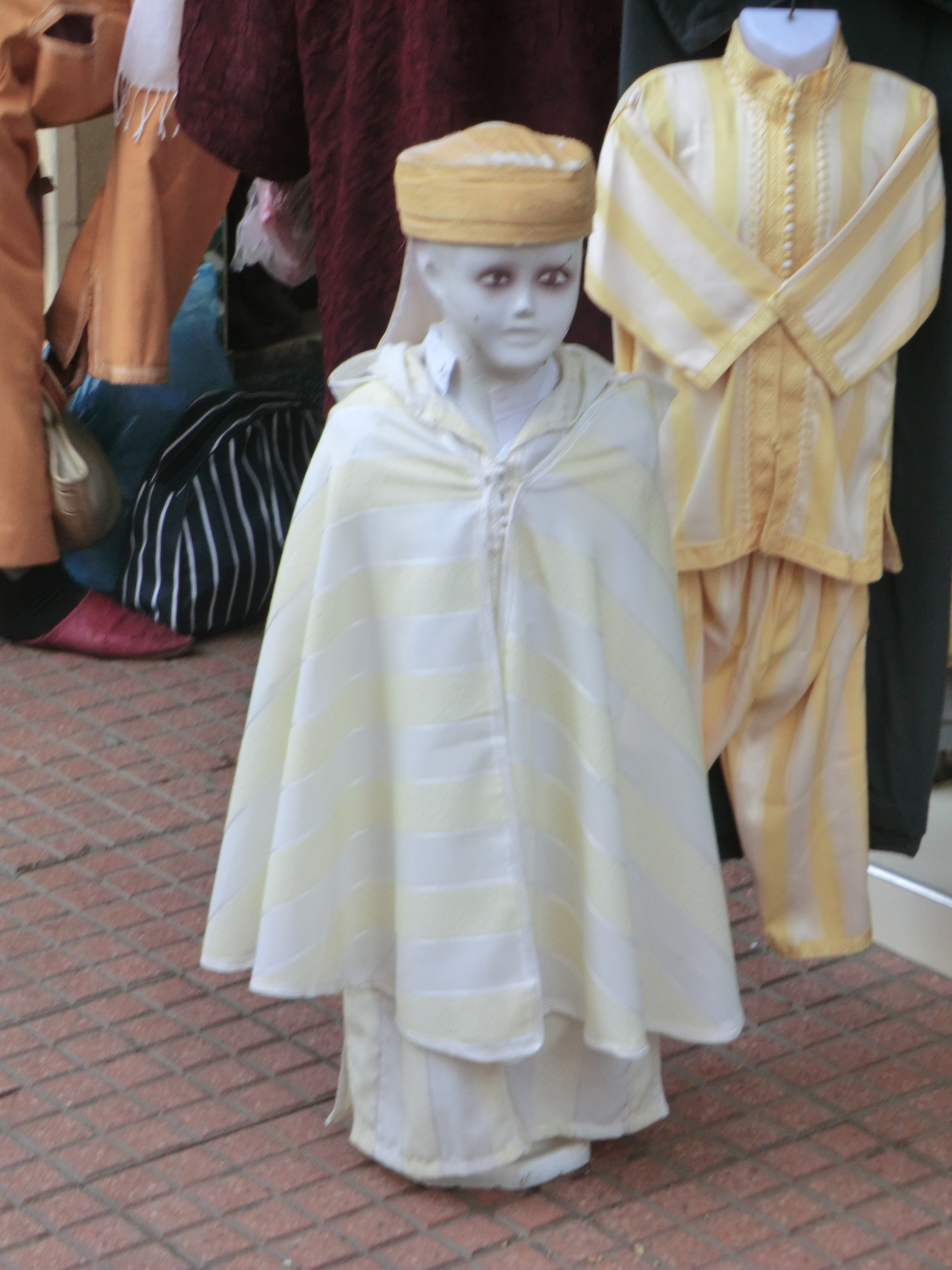 Very visible too is another thread in the texture of Moroccan souqs that fascinates me. Clothes shops are everywhere, and densely populated by mannequins. These mannequins are as various as humanity, with every tone of skin and every possible shape of nose. Some have sunglasses moulded onto their foreheads, some are smoothly featureless and bright green, or red, like Spiderman. Others have robotic faces made of horizontal strips, like the cylinder-head of a motorcycle. Some are just torsos with coathanger-hooks for suspending them; others headless on pedestals; yet others half-men, backless like coffin-suits, existing only in their forward-facing aspect.