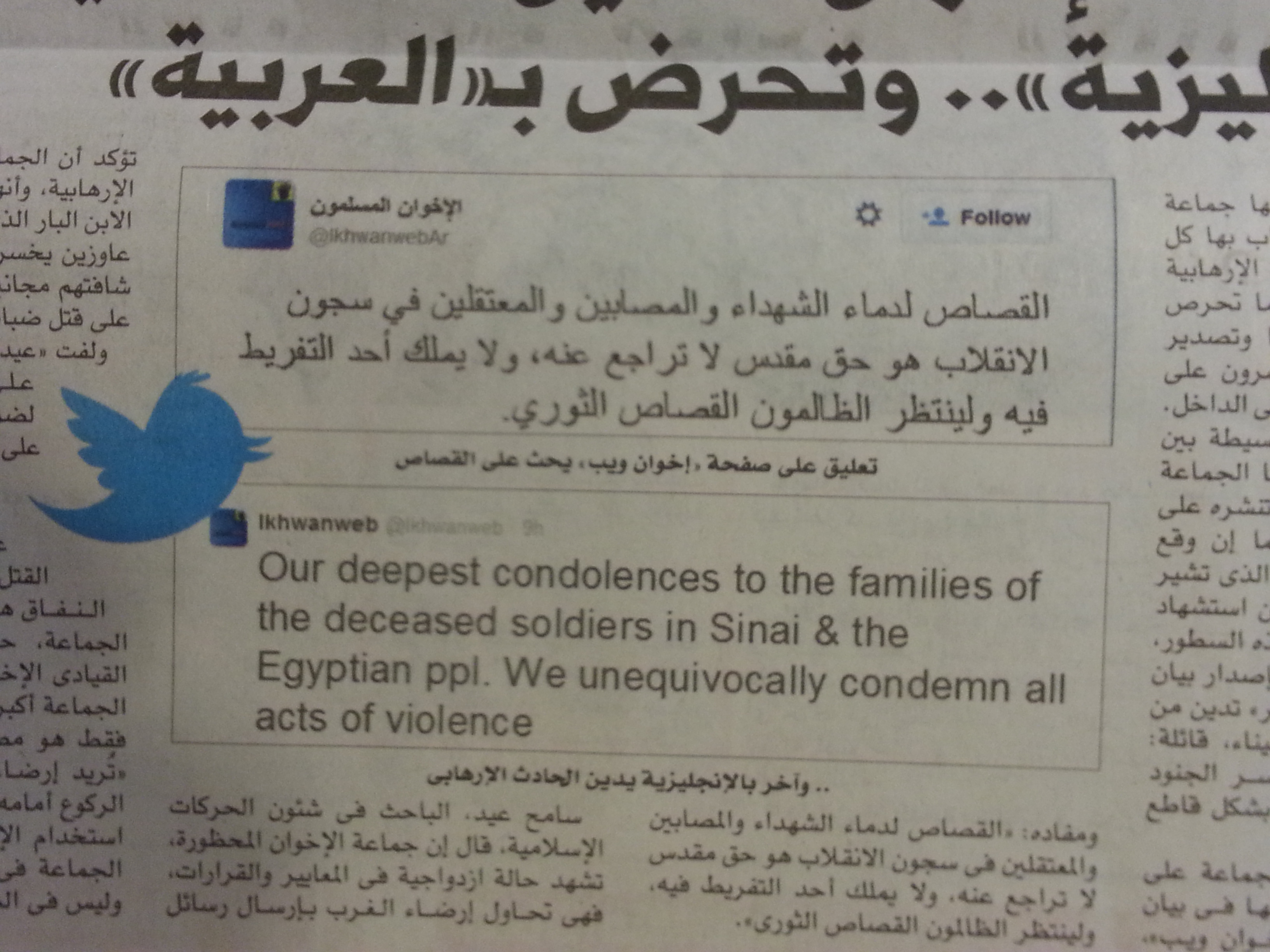 That the Muslim Brotherhood is a violent organization bent on overthrowing the Egyptian state (for starters) is quite clear. It is also profoundly dishonest and speaks with a decidedly forked tongue, as this screen-grab of two rather contradictory and simultaneous ‘official’ Brotherhood tweets (assuming it to be genuine) demonstrates: in English (@Ikhwanweb) the writer is all condolence for the dead soldiers’ families and soft soap, “We unequivocally condemn all acts of violence.” In Arabic (@IkhwanwebAr) he talks of “settling accounts for the blood of martyrs and prisoners,” and “the revolutionary reckoning awaiting tyrants.” Odd twittery bedfellows.