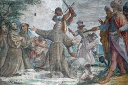 The Sultan received the five, granting them permission to preach. With his permission, the five preached in the marketplace with little success. However, many of the people were greatly upset by their presence, and requested their arrest. To avoid arresting the friars, the Sultan arranged for them to live with a Christian friend and prince, Dom Pedro Fernandez. This they did, but continued travelling into the city to preach. Eventually, they were again arrested, beaten, and bribed in attempts to get them to desist in their preaching and return home. When offered power, riches, and position, they replied, “We despise all those things for the sake of Christ.”