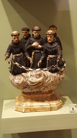 In the church’s treasury I came across a small sculpture of ‘the Five Martyrs of Morocco,’ in heaven-ward motion on a cloud, which interested me. This little quintet had hitherto passed me by. In the church itself is an altar dedicated to the same martyrs, their images spread across the golden retable, one of the friars, rather gruesomely, in the actual moment of decapitation. Above, almost as an afterthought, are a larger numbers of Franciscan martyrs crucified in Japan. The whole thing is a celebration of persecution sought out, and death willingly, even enthusiastically, suffered for God.